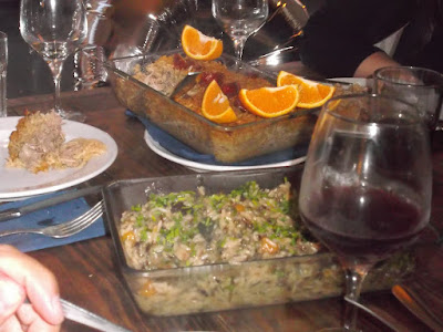 A comida... oh meu deus, a comida! "Eu sei lá se é o chinês, ou se é o caralho" mas, de ano para ano, eles ficam melhores! Este ano, comemos tudo a que tínhamos direito! Para começar, pãozinho do bom, azeitonas e patê. Depois, umas entradas que mais pareciam pratos principais: Linguiça no forno, Escabeche de legumes, e Trouxas de queijo chèvre com doce de fruta caseiro (eu que nem sou muito fã de queijo, comi a minha Trouxa e as dos vegetarianos! Ahahahah!). A seguir, os pratos que agradavam a todos, desde o básico Arroz de pato e Bacalhau assado com broa, uma saladinha, e ainda Cogumelos à brás (que estavam uma supimpa!), e Arroz selvagem com legumes! Ficaríamos por aqui? Nunca! As sobremesas variaram entre o Bolo de chocolate com topping de caramelo salgado​ e, a Mousse de maracujá! Para terminar, todos tivemos direito a um cafézito Nespresso! =P